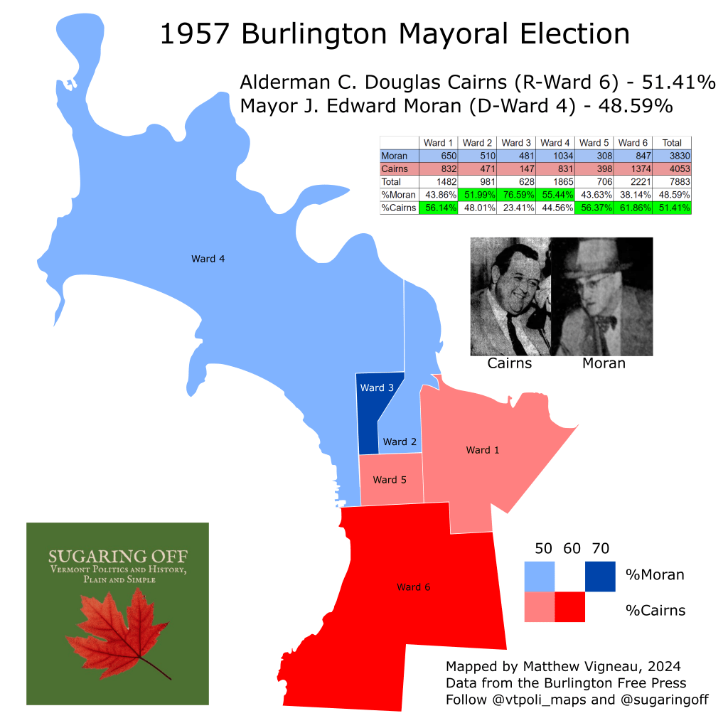 In 1957, Cairns received the GOP nomination for mayor and challenged the longtime incumbent Moran. In an upset, he pulled off a narrow victory. He ran up the margins in his home base in Ward 6, where the affluent and WASPy Hill Section was able to outvote the working class Irish and French Canadian denizens of the South End and Lakeside, and had strong performances in Ward 1, home to the University of Vermont, and the heavily Italian Ward 5, which had not yet been ravaged by urban renewal. Moran’s base was in Wards 2 and 3, in the city’s Old North End, home to many poor French Canadian and Irish Catholic voters. He also performed well in Ward 4, which stretched from the waterfront up to the newly suburbanizing New North End.