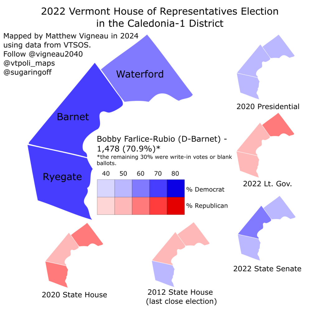 Like many house districts in the Northeast Kingdom, this seat is a lot bluer federally than it is down-ballot. Joe Biden won all three towns with over 50% of the vote in 2020. However, in 2022, both Phil Scott and Joe Benning swept the district, and even longtime incumbent State Senator Jane Kitchel ran behind her district-wide average in Ryegate and Waterford.