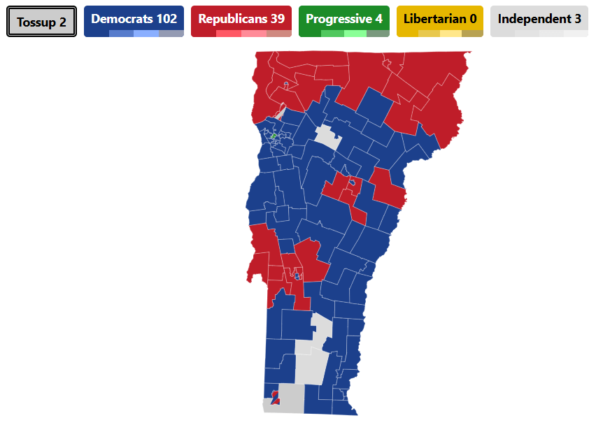 With so little time remaining in the campaign, it’s time for one final update of the Vibes-Based Forecast and making some predictions about what Vermont politics will look like on November 6th. I’ll be trying to eliminate all the races currently marked as toss-ups with the full realization that I may well eat crow for doing so on November 6th. If you want to skip my ramblings, I have maps at the end showing my predictions for both chambers and the overall number of seats each party will win.