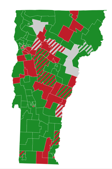 The geographic results of the vote on sending H.454 to the governor. Green indicates a yes vote, red indicates a no vote, grey indicates that the member was absent and did not vote.