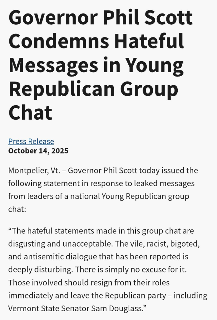 My, my, how times change. In 2024, Governor Phil Scott endorsed now-Senator Samuel Douglass for the open Orleans County State Senate seat, saying “Sam Douglass will work with me in Montpelier to grow the economy and make Vermont more affordable. In the Senate, he’ll advocate for lower taxes, addressing crime, and finding real solutions to the housing crisis. Sam is a common sense candidate who will always vote in the best interest of the Northeast Kingdom, regardless of party. We need him in Montpelier, and I encourage the people of Orleans County to vote for Sam Douglass for state Senate!”